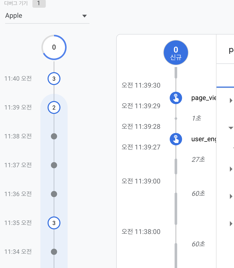 개발자 콘솔을 켜야지 동록을 한다고 한다. 시키는 대로 켜서 테스트할 페이지를 클릭 후 다시 디버그 뷰를 새로고침해보면 입력되고 있음이 확인된다.