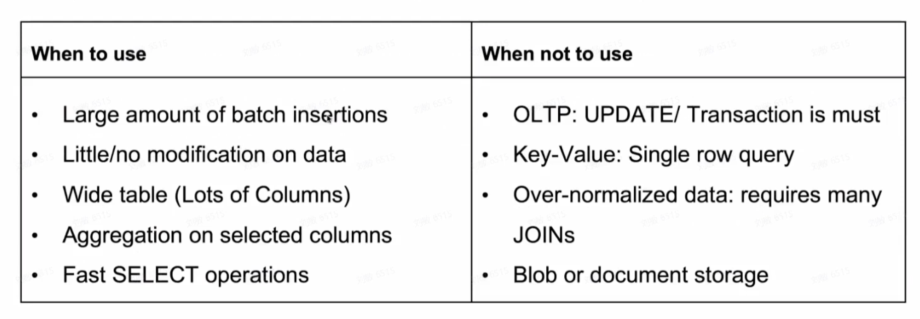 - Requires high throughput when processing a single query (up to billions of rows per second per server).