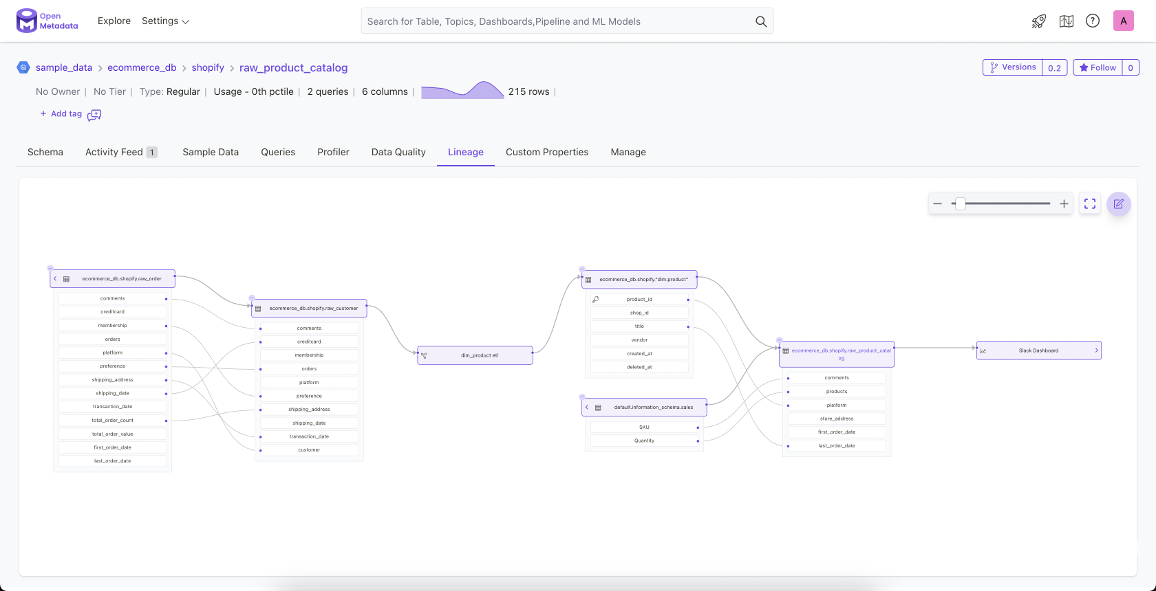 Supports a comprehensive lineage for all data assets by capturing the relation between entities. Traces the path of data across tables, pipelines, and dashboards. Manual lineage helps augment the lineage captured from machine metadata with user knowledge.