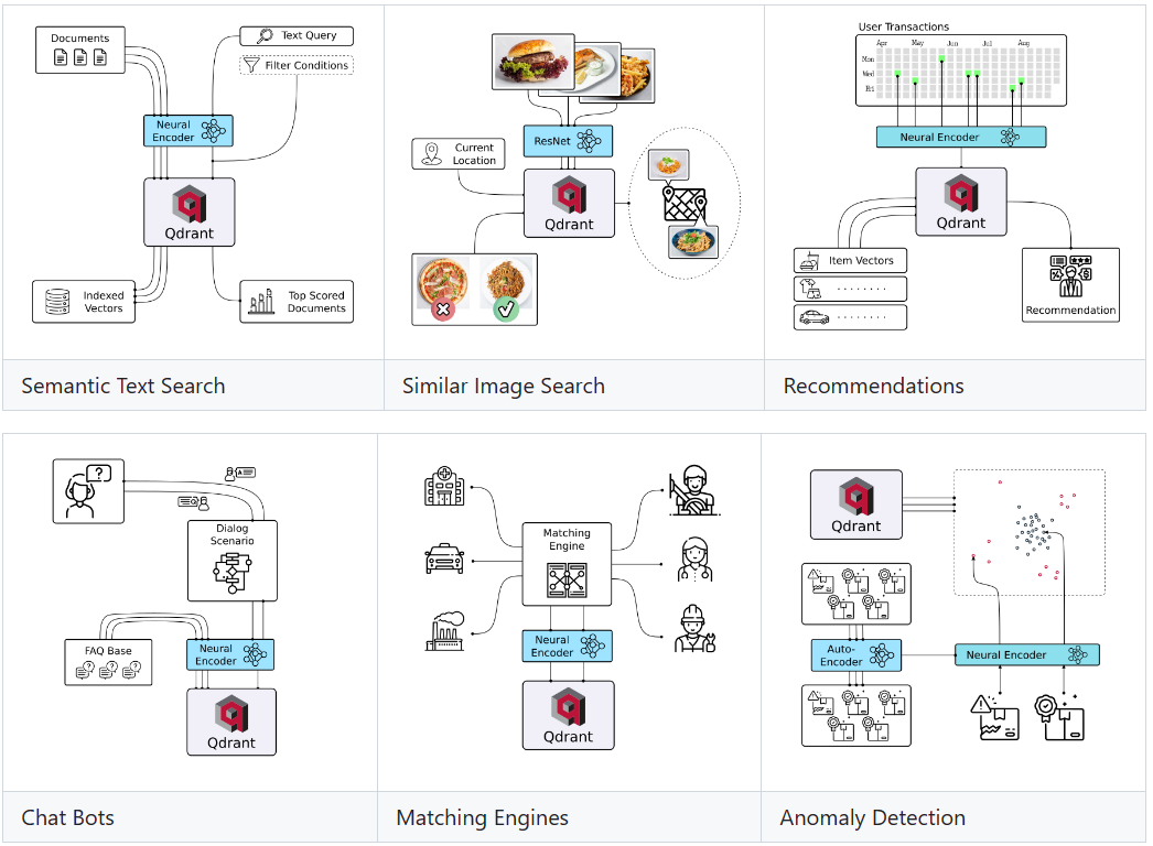 Qdrant를 사용하면 임베딩 또는 신경망 인코더를 매칭, 검색, 추천 등을 위한 본격적인 애플리케이션으로 전환할 수 있습니다.